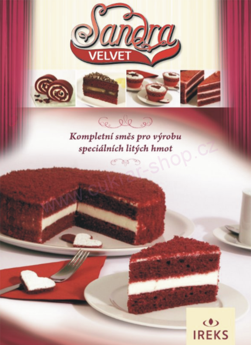 Sandru VELVET charakterizuje následující popis: Velkou předností použití Sandry VELVET je jednoduchá příprava korpusu. Díky své specifické barvě se hodí pro výrobky amerického stylu „Red Velvet“. Možné je její samostatné použití s pouhým dozdobením povrchu, jako je tomu například u výrobků typu „Cupcakes“ neboli košíčků. Roládové pláty ze Sandry VELVET jsou pružné a ohebné. Korpusy z této hmoty jsou šťavnaté, mají kompaktní a hladký povrch.