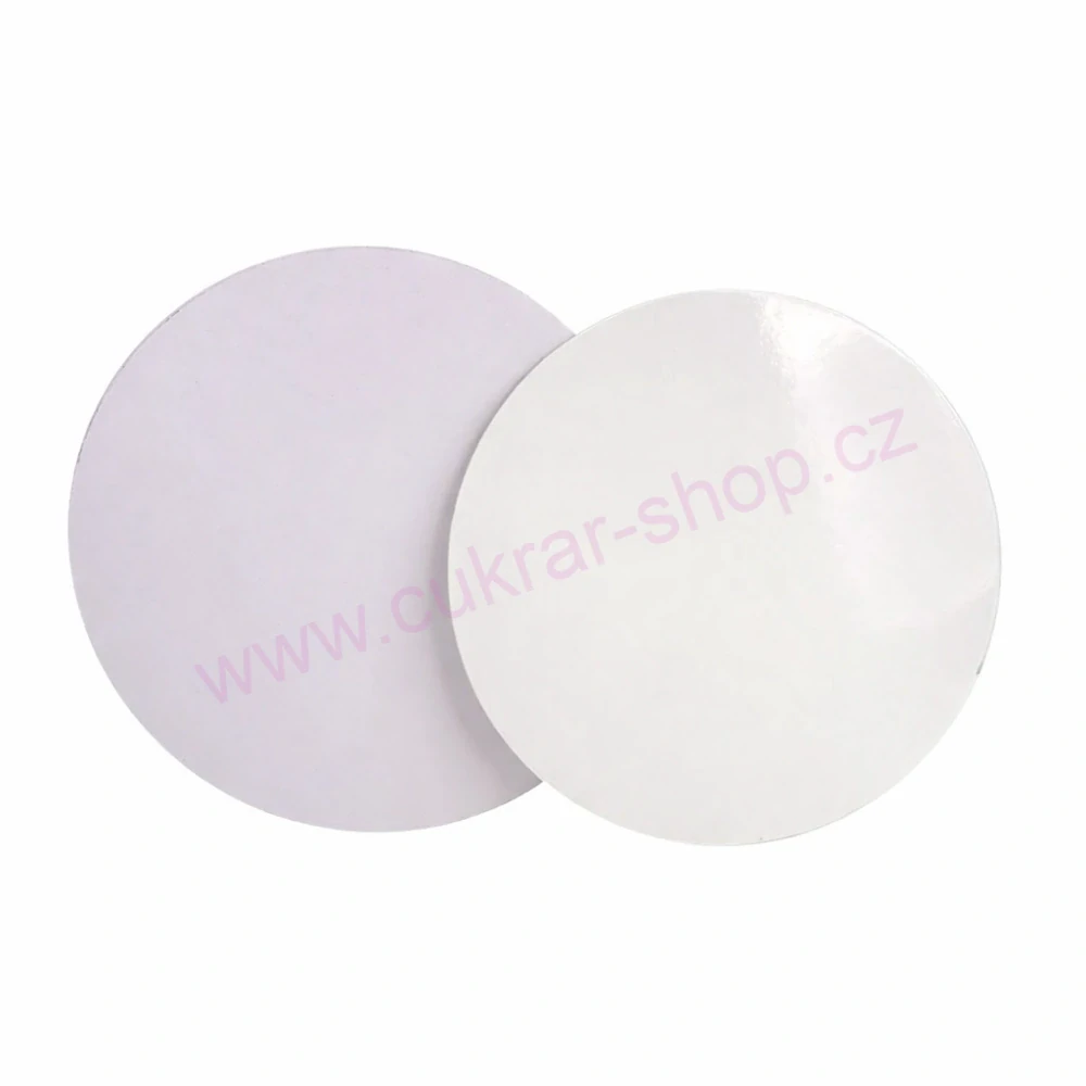 Lepenková, zpevněná kruhová podložka pod dorty a jiné cukrářské výrobky, laminovaná bílou folii.